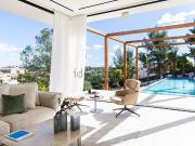 ...a privada, amplias terrazas, un atrio central que inunda el interior con luz natural y aparcamiento subterráneo para tres autos. Situada en un terreno de suave pendiente, la villa está rodeada de jardines con una piscina infinita en el punto más bajo...